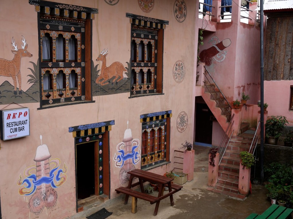 আর আমরা যেমন লেবু, এবং লঙ্কা (অসভ্য কিছু ভাববেন না মাইরি…) ঝুলিয়ে খারাপ নজরের হাত থেকে রক্ষা পাওয়ার চেষ্টা করি, ভুটানেও তেমনি দেয়ালে দেয়ালে নানান রঙের ফ্যালাস-এর ছবি এঁকে, একইভাবে খারাপ নজর এবং পরশির গুজব থেকে রক্ষা পেয়ে থাকে।