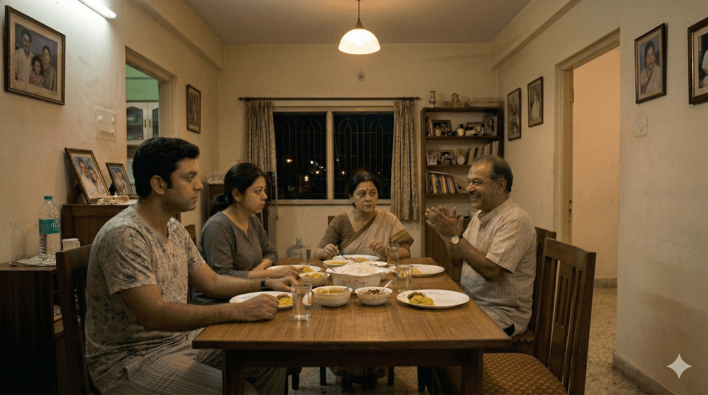 সোহিনী রান্নাঘর সাফ করে এসে বসে, সুকোমল বাড়ি ঢোকার থেকে সে একটাও কথা বলেনি। মা মন দিয়ে সিরিয়াল দেখছে। প্রায় মিনিট চল্লিশেক পর, সবাই মিলে খেতে বসা হয়। এক গরাস মুখে তুলে, মা বলেন,